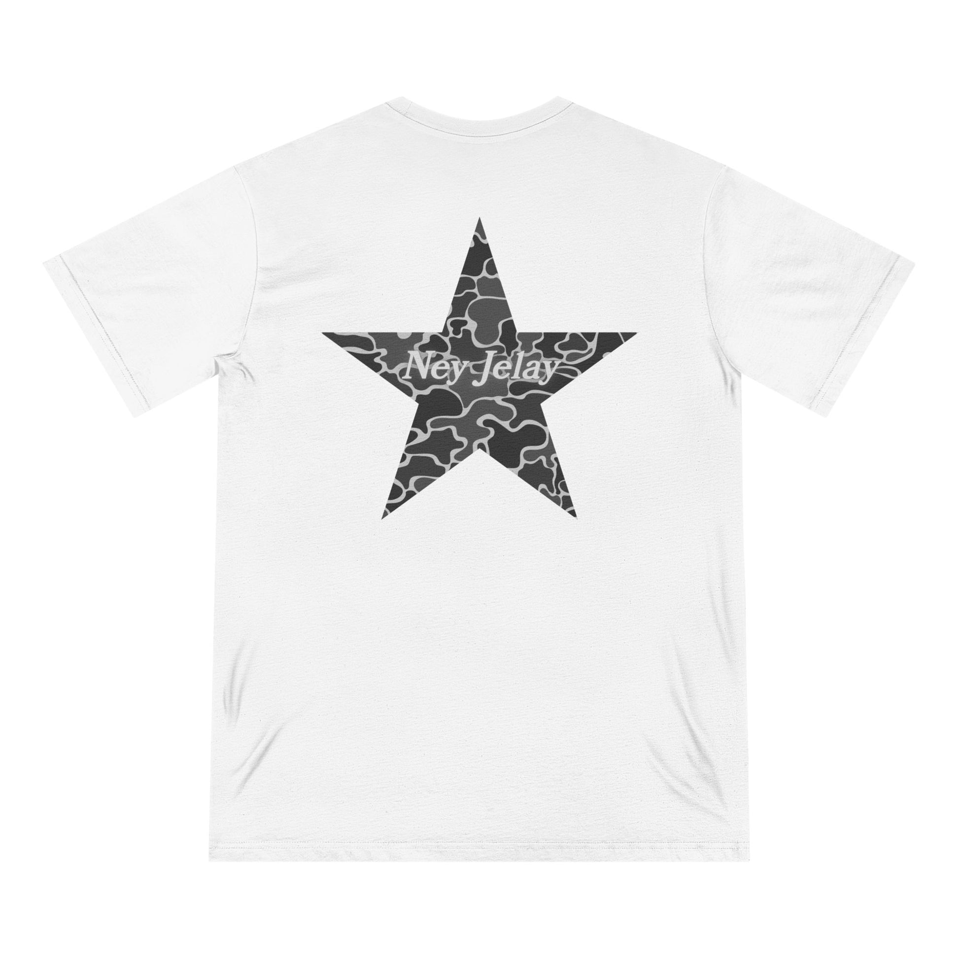 The word speaks for itself. Brave is set in grayscale camouflage, standing sharp against the white canvas. On the back, the star returns, filled with the same camo pattern, marked with Ney Jelay. It is a uniform for those who face resistance and do not back down.